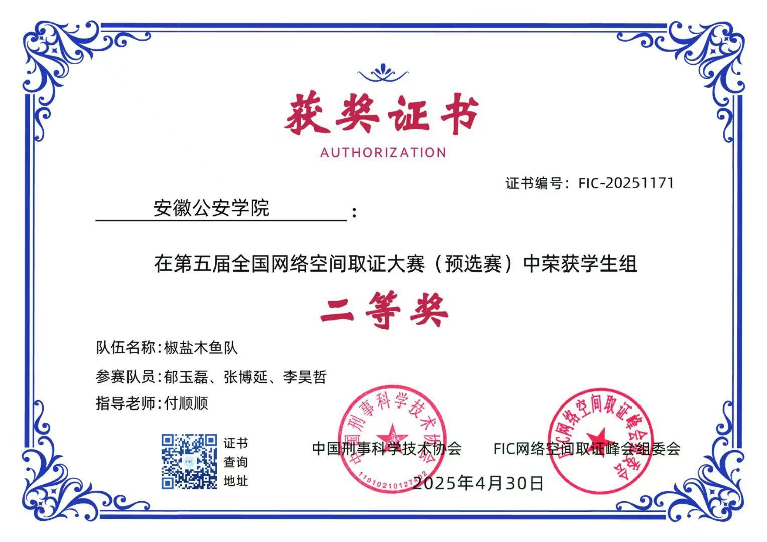 5月, FIC网络空间取证峰会组委会主办,江苏警官学院承办的第五届全国网络空间取证大赛正式开赛。预选赛中,由我院网安专业学生郁玉磊、张博延、李昊哲组成的“椒盐木鱼队”,凭借扎实专业能力荣获预选赛二等奖,成功晋级线下决赛。