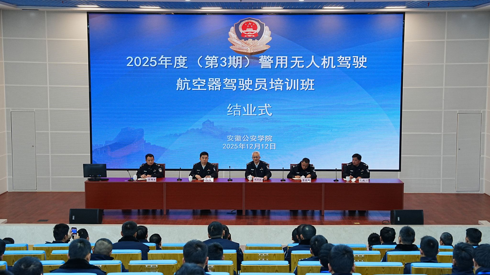 为深入贯彻落实省领导关于加快低空经济发展、强化低空安全管控的指示精神,以及覃书记在首期“安徽公安科创沙龙”上的指示精神,在省公安厅特巡警总队的全程指导和有力支持下,安徽公安学院于2025年12月12日成功举办2025年度(第三期)警用无人驾驶航空器驾驶员培训班结业式。本期为期25天的集中培训圆满完成,90名参训学员全部通过警用无人机理论与实操考核,通过率达100%,标志着全省警用无人机专业人才培养与低空警务实战能力建设取得又一重要进展。