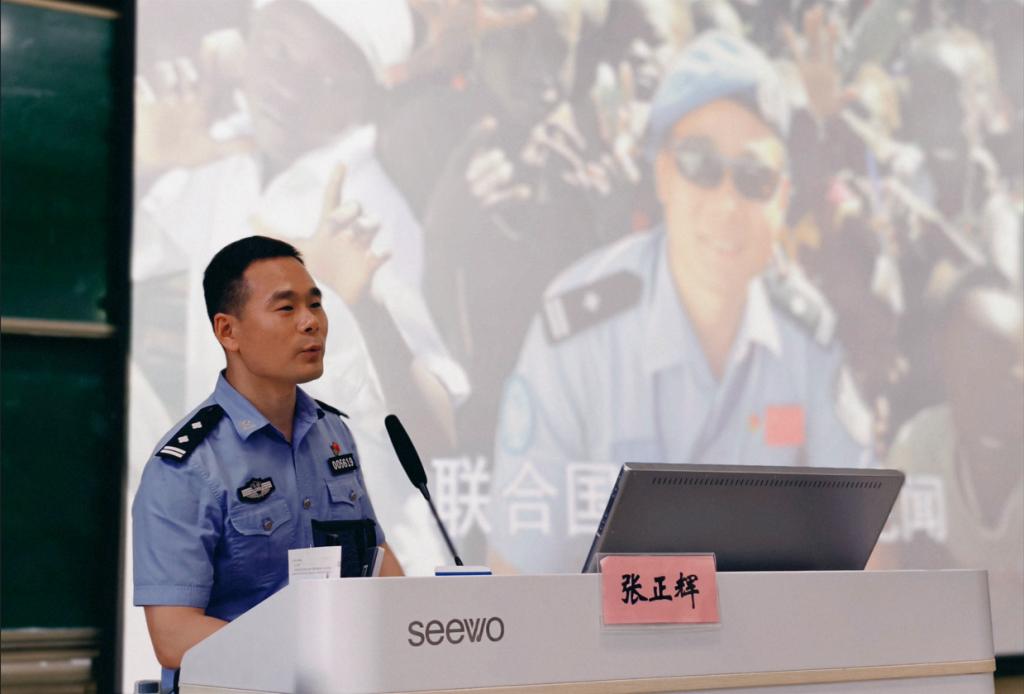 会后,出入境管理局案件大队大队长张正辉为师生们做了《联合国维和行动见闻》专题讲座。他结合2018年赴南苏丹执行维和任务、护卫难民营安全的亲身经历,用血与火交织的真实案例,为师生呈现了一堂生动的“国际警务实践课”。他以极端环境下的应急处突、跨文化执法的现实案例,启示师生以实战标准锤炼警务技能,将“纸上战术”转化为危机应对的真本领;以勇担难民营案件队长,为难民营安全做出杰出贡献,最终荣获联合国维和勋章的亲身经历,诠释“忠诚无畏”的警魂,激励师生以更坚定的政治信仰和纪律意识,扛起守护家国平安的重任。这场讲座既是教育的“强心剂”,更点燃了从课堂到实战、从理论到实践的行动自觉,让师生深刻体悟到,和平是披荆斩棘的坚守,警徽是跨越国界的诺言。