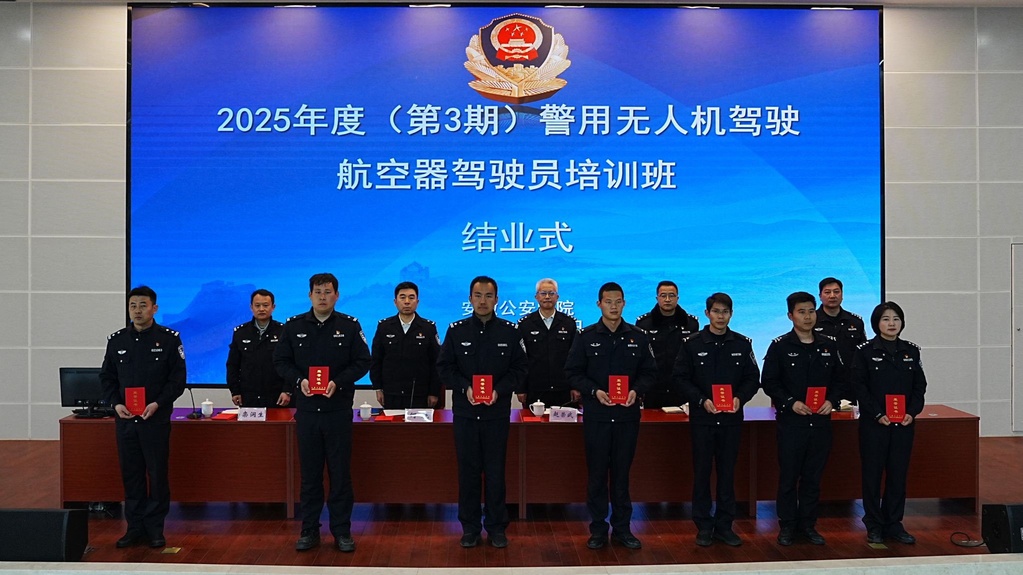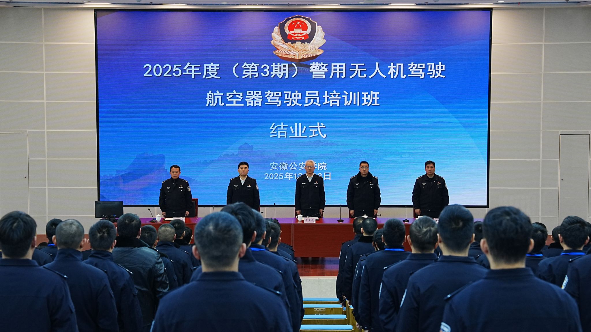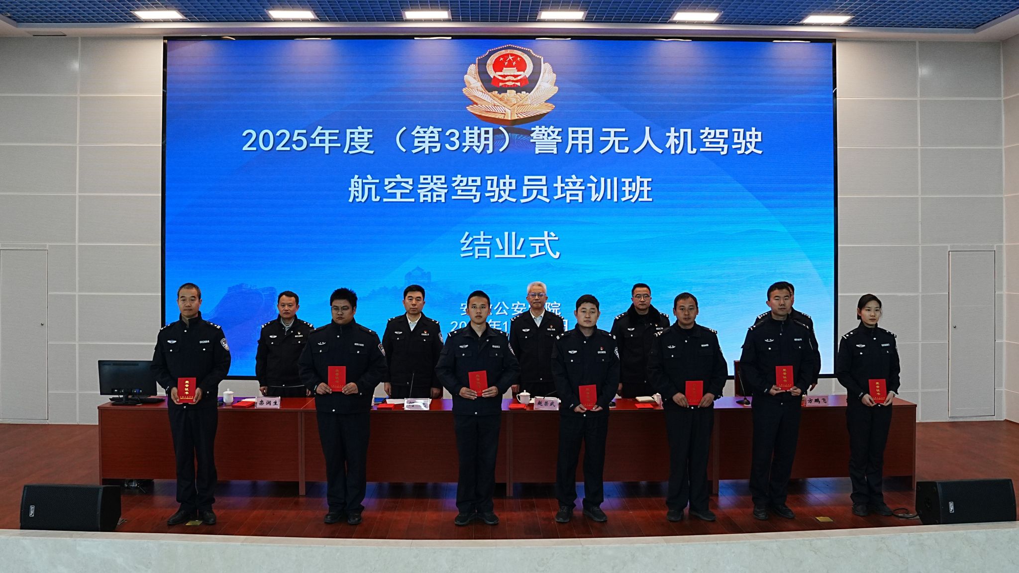 为深入贯彻落实省领导关于加快低空经济发展、强化低空安全管控的指示精神,以及覃书记在首期“安徽公安科创沙龙”上的指示精神,在省公安厅特巡警总队的全程指导和有力支持下,安徽公安学院于2025年12月12日成功举办2025年度(第三期)警用无人驾驶航空器驾驶员培训班结业式。本期为期25天的集中培训圆满完成,90名参训学员全部通过警用无人机理论与实操考核,通过率达100%,标志着全省警用无人机专业人才培养与低空警务实战能力建设取得又一重要进展。