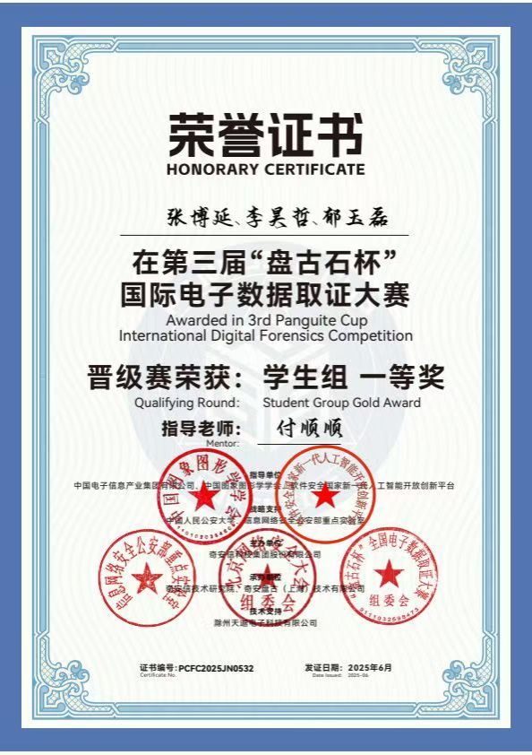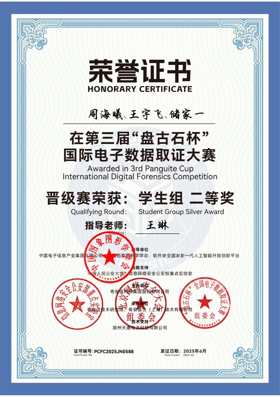 在第三届“盘古石杯”全国电子数据取证大赛中,我院学子成绩斐然。预选赛阶段,“椒盐木鱼队”(郁玉磊、张博延、李昊哲)荣获一等奖,另有三支队伍分获二、三等奖。决赛中,“椒盐木鱼队”再获团队三等奖。