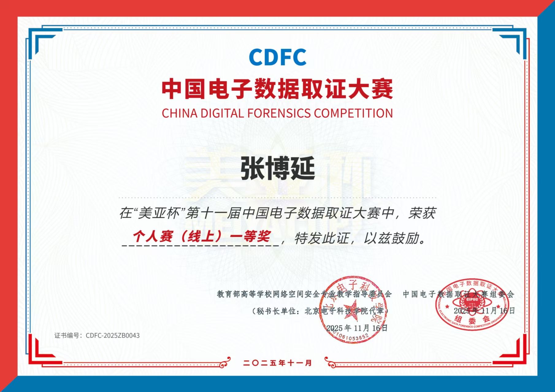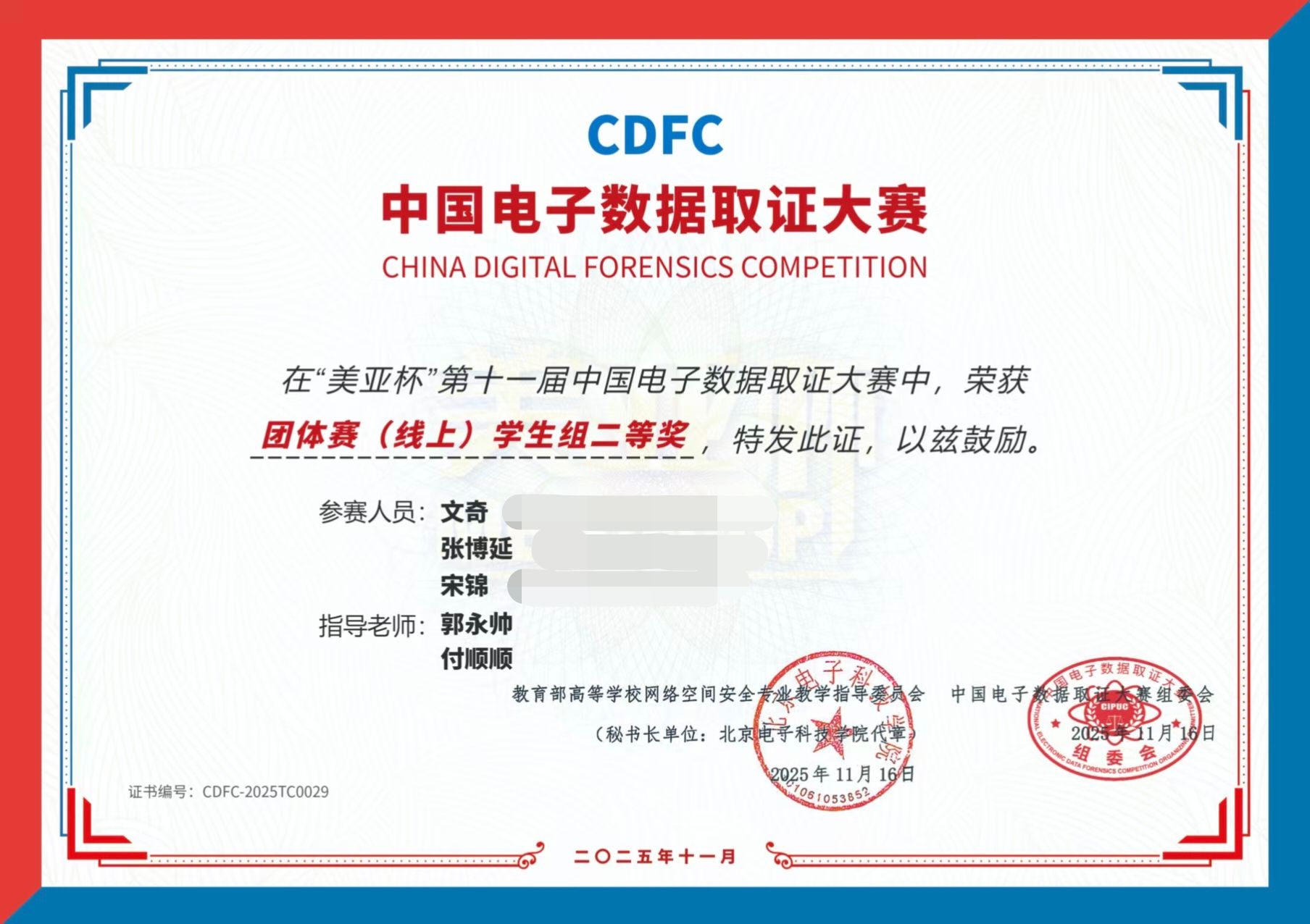 在第十一届“美亚杯”中国电子数据取证大赛中,我院学子表现突出。个人赛方面,张博延获线上个人一等奖,高菲、李彬、储家一、朱展泽、周海曦五人获线下个人三等奖。团体赛方面,“自爆卡车队”(张博延、宋锦、文奇)获线上团体二等奖,“暗黑牢哥队”(周海曦、储家一、王宇飞)获线下团体三等奖,另有“PorBox队”(柯易辰、赵从翔、孙阿杰)和“ceshi队”(杨天啸、杨哲伦、朱沛霖)获得线上团体三等奖。学院因组织有力荣获“优秀组织奖”。