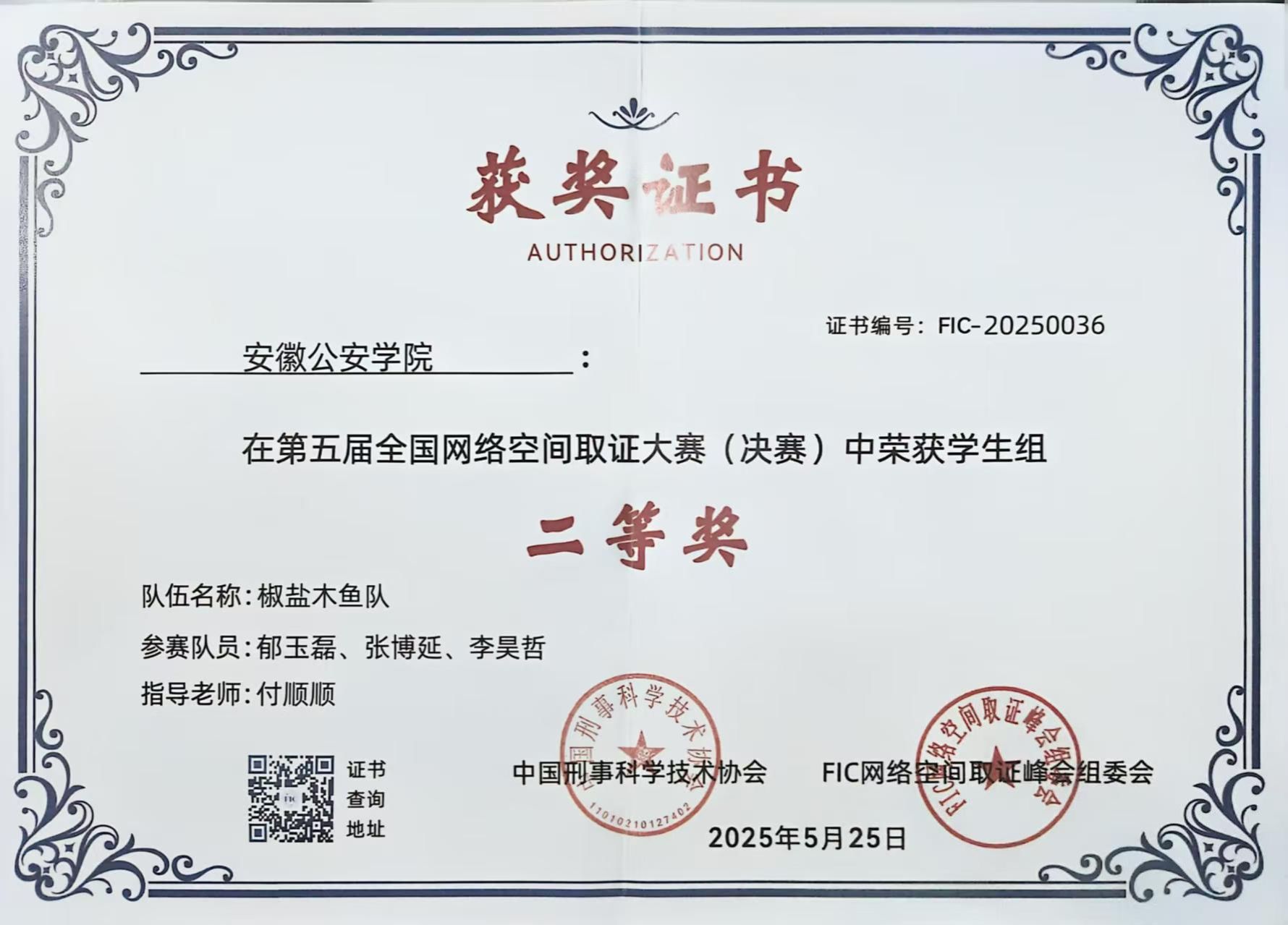 5月, FIC网络空间取证峰会组委会主办,江苏警官学院承办的第五届全国网络空间取证大赛正式开赛。预选赛中,由我院网安专业学生郁玉磊、张博延、李昊哲组成的“椒盐木鱼队”,凭借扎实专业能力荣获预选赛二等奖,成功晋级线下决赛。